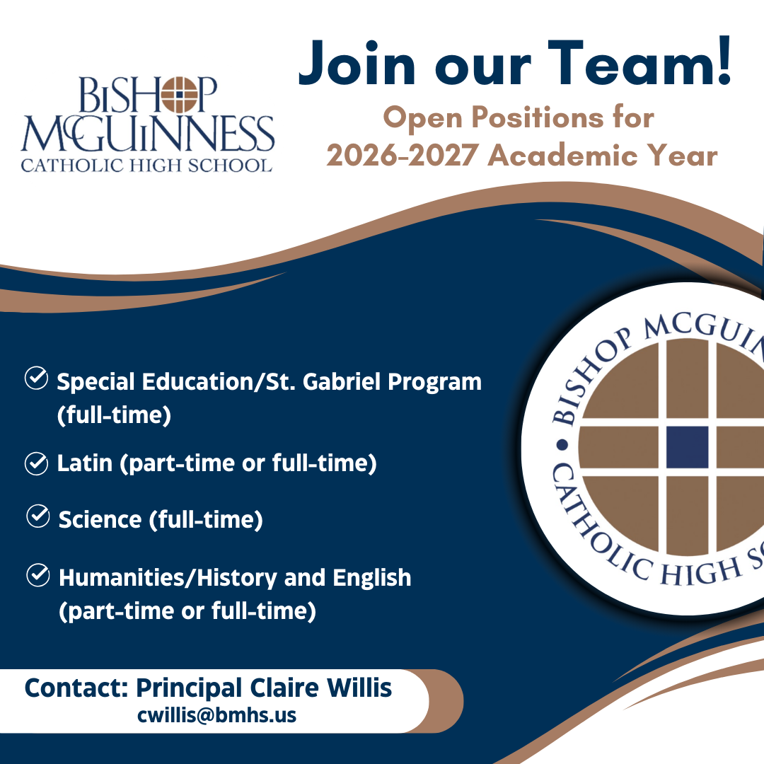 Bishop McGuinness Catholic High School seeks to hire and retain outstanding faculty and staff who are committed to ministering to our students as they develop a closer relationship with Christ. Our currently teaching faculty have an average of more than 15 years of classroom experience, with 55% holding an advanced degree.